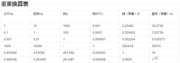 在地球引力下, 重量和质量是等值的, 但是度量单位不同。质量为1千克的物质受到外力9.8牛顿时所产生的重量称为1千克重。一般常用质量单位来代替重量,隐含乘以重力加速度。在中国旧时用斤、两作为重量单位。磅、盎司、克拉 等也作为重量单位。