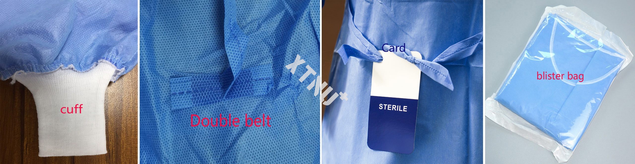 gown is made by SMS, with EO sterilized, ultrasonic welding, knitted cuffs, and velcro at neck. Can be used for nurse, doctor and operating room very well.